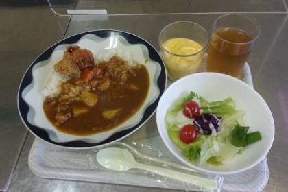 唐揚げカレー、サラダとプリン付きです。異口同音に「おいしい!」の声。