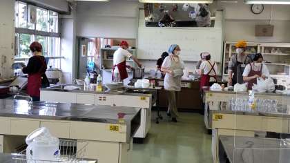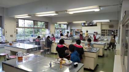 食事の時間です。メニューはカレーライスから揚げ付き。サラダ。デザートにプリンです。とても美味しかったです。地域の皆様ありがとうございました