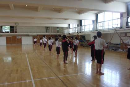 5時間目は1年生保健体育で教育実習の研究授業が行われました。今日の授業は剣道で、足さばき、素振り、正面打ちでした。