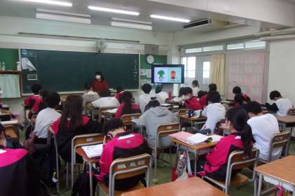 1年生の英語の授業です。歌の歌詞から発音を学ぶ、交通手段を使って目的地まで行く表現方法などバラエティに富んでいました。