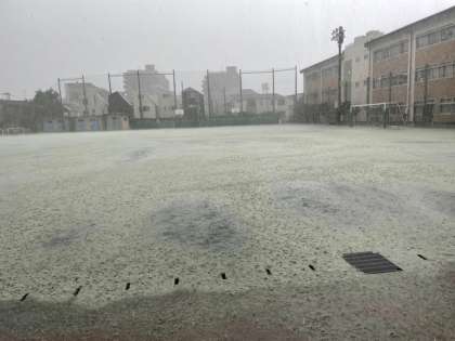 午後になったらいきなりの雷雨で校庭も水浸しに!