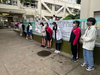 笹原小学校の生徒と一緒に挨拶運動に取り組んでいます。
