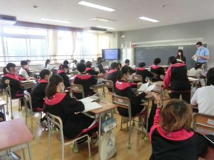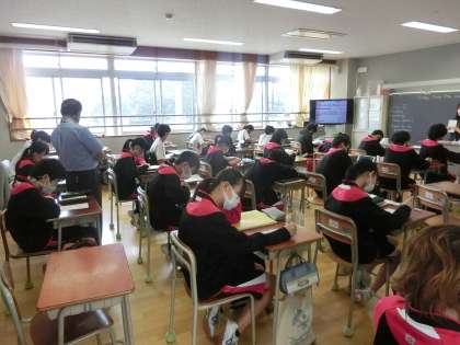 2年生の英語の授業です。今日はALTの先生とのティームティーチングで、世田谷区教育委員会より講師の先生にご来校いただき研究授業を行いました。