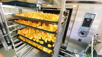 厚揚げとじゃがいものケチャップ炒めに使うじゃがいもは、揚げずに少量の油をまぶしてオーブンで30分間じっくり焼きました。おいしそうな焼きめがついた今日のワンシーンです。