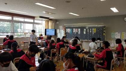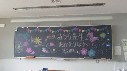 2年生の掲示物、黒板アート、国語の授業の様子です。