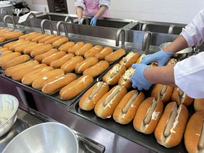クリームウィンナードックを作っているところです。切り込みを入れたパンに、手作りホワイトソース、ウィンナーを挟み、チーズをかけて焼きました。720食みんなに均等に作っていきます。