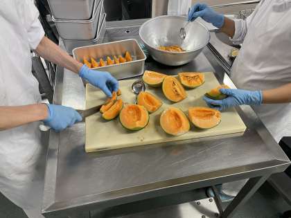 メロンなどの果物は、洗浄した後に切り、クラスごとに数えていきます。加熱しない食品は白いエプロンをつけて扱うルールになっています。