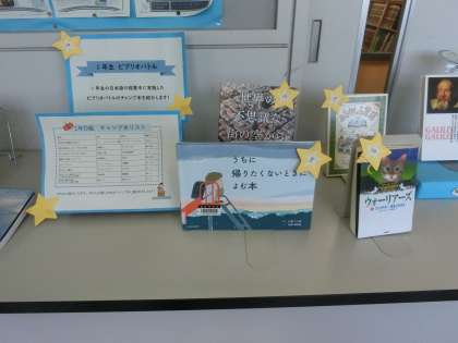 メディアセンターの前に1年生の教科「日本語」で行われたビブリオバトルのチャンプ本を紹介しております。是非読んでみてください。