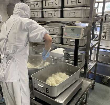 炊いたご飯をクラスごとに計量しているところです。給食室の炊飯釜は、1つで約14kgのご飯が炊きあがります。炊きたてのご飯を食缶に移しているので、教室でフタを開く時は湯気の名残の水滴に気をつけてください。