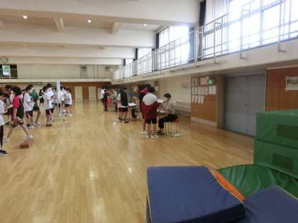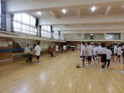 1年生は2クラスずつ格技室でスピーキングテストを行いました。1時間目はE・F組でした。、