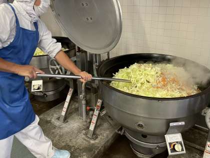 山盛りの野菜を炒めて、あんかけ焼きそばのあんを2釜で作っていく時の様子です。
