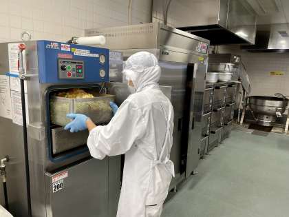 真空冷却機に茹でた野菜を入れているところです。給食では、和えものに使う野菜も加熱する決まりになっています。釜で茹でた野菜をこの機械に入れて温度を20度以下に冷ましてからドレッシングなどと和えて提供しています。