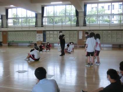 グループを作って、グループとして決められたテーマに即したストップモーションを演じ、自分が演じている役割を演者一人ひとりがストップモーションのまま説明しました。