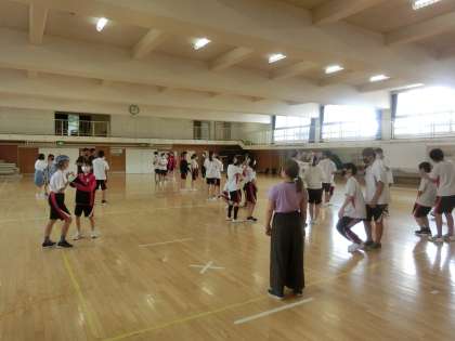 教科「日本語」のみんなでつくる演劇の単元で「演劇」をつかって考える「子どもの権利条約」のワークショップです。今日は各クラス2時間ずつ3クラス実施いたします。2人1組になって、「歯医者と患者さん¥「コンビニの店員とお客さん」「先生と生徒」「ボールとバット」など様々なストップモーションを行ったいる様子です。