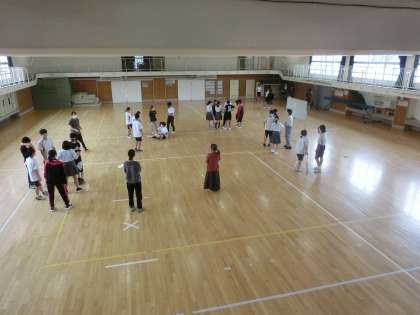今回の演劇の主題である「子どもの権利条約」についてのお話の後、実際に演劇が始まります。グループごとに自分たちが演じる「権利」についての劇を練習している様子です。