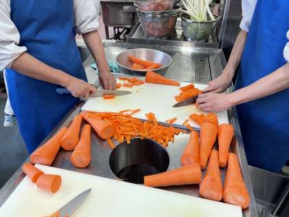 汁物のにんじんや大根も「短冊」に切り、ネギも笹をイメージして斜めに切ってもらいました。スープには星形のかまぼこも浮かべ、可愛らしい行事食ができました。