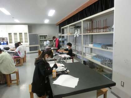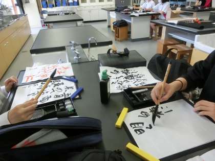 書道部の活動です。書道部は日々の書字の活動、展覧会への出展のほかに入学式や卒業式、運動会などに使用する立て看板も書いております。理科室前に素敵な作本が展示してありますので、ぜひご覧ください。
