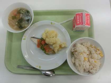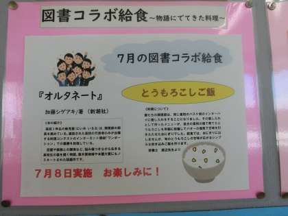 今月の図書コラボ給食は、加藤シゲアキ著『オルタネート』より「とうもろこしご飯」でした。ごはんの中にトウモロコシが入ることで甘みがましておいしくいただきました。