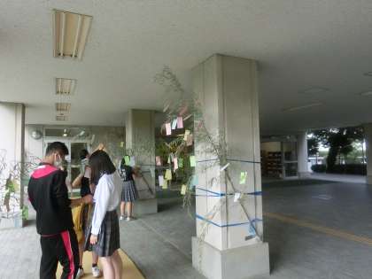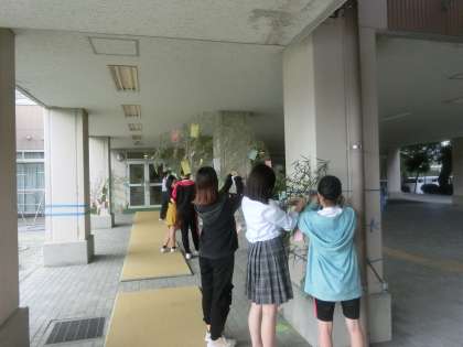 本日の放課後、七夕ウィークで集まった短冊を 生徒会執行部が中心となって笹の葉に飾りつけを行いました。