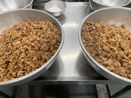大量調理で味を落とさない工夫として手間をかけてもらっています。