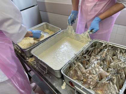 アジフライは、給食室で1つ1つ衣をつけています。塩こしょうで下味をつけたアジに、衣とパン粉をつけていきます。身は柔らかく、周りはカリッとしておいしく揚がりました。