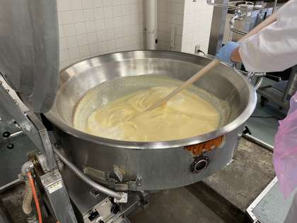 桃の濃厚ミルクゼリーを作っているところです。プリンのような色ですが、色の正体は桃です。