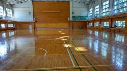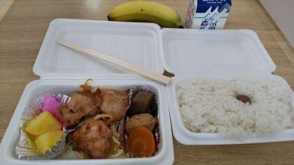 体育館は換気中、生徒は昼食です。今日はバナナがついては います