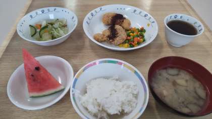 三日目の夕食です。子ども達のトンカツは3切れです。パワフルな顧問に1切れプレゼントしましたので、写真は2切れです。