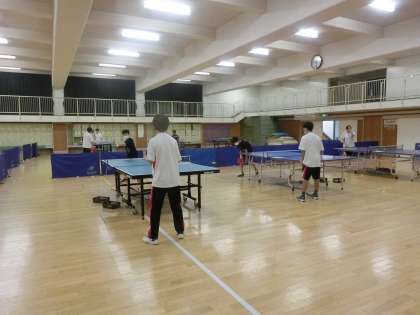 午前中の格技室は剣道部と卓球部が半面ずつ使用しています。こちらは卓球部の練習風景です。