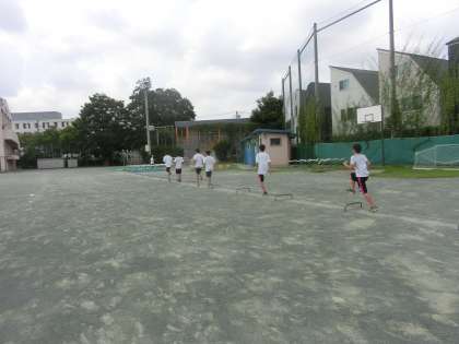 陸上競技部の練習の様子です。ミニハードルを使ってもも上げと上体のバランスをとる練習を行いました。