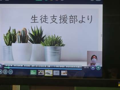 校長先生のお話のあと生徒支援部長の先生から夏休みの振り返り、二学期の生活についてのお話がありました。そのあとの校歌は音楽の先生の歌唱を動画配信いたしました。