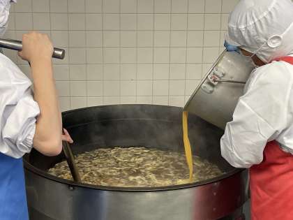 かきたま汁の卵を回し入れている様子です。今日使った卵は全部で20kg (一般的なMサイズの卵だと400個分!)