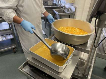 ゼリーが冷えて固まってからフルーツとあわせていく作業の様子です。1クラスずつ計量しながら作っていきます。