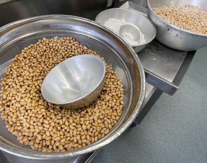 給食室で大豆を戻してから蒸し、蒸した大豆に片栗粉をつけて揚げ、三温糖と豆乳を使った甘いタレと絡めて作りました。