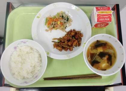 ごぼう(宮崎)、もやし(栃木)、にんじん・ねぎ(北海道)、キャベツ(群馬)、鶏肉(岩手)、小松菜(茨城)、米(秋田)
