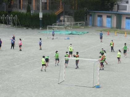 2年生の保健体育の授業では、水泳が終わりハンドボールが始まりました。基礎となるキャッチボールを行いルール説明を受けた後ゲームを行いました。