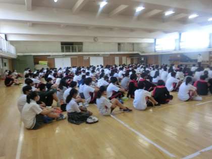 2年生は今日の朝学活の時間に、職業体験に向けての全体集会を開きました。担当の先生より身だしなみや言葉遣いなどの指導がありました。