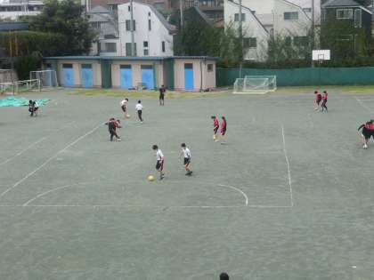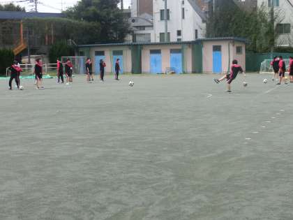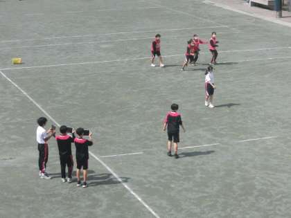 3年生の保健体育ではサッカーが始まりました。1対1のボールキープ、対面パス、ドリブルからの1対1を行った後、最後はラインゴールを使用した3対3ミニゲームを行いました。ゲームを行っていないグループはタブレットで担当するプレーヤーの動画をとり授業の最後の振り返りに利用しました。