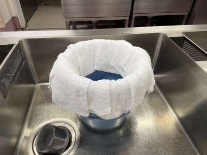 給食時間に各クラスへ渡すワゴンには、必ず台ふきんを乗せています。これは毎日給食室で洗浄して準備しているものです。