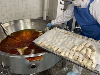 給食室で1つ1つ巻いた春巻きを、ていねいに揚げてもらいました。