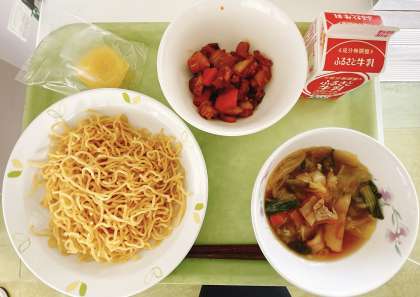 しょうが(高知)、にんにく・ピーマン・ねぎ(青森)、にんじん・大根・玉ねぎ(北海道)、青梗菜(茨城)、きゃべつ(群馬)、モウカザメ(宮城)、冷凍りんご(青森)