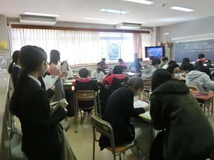 3年A組の家庭科の授業です。今日は消費生活が環境にどのようなかかわりを持っているかについての授業でした。家庭科の授業には東京農業大学の学生の皆さんが多数参観に来ていました。