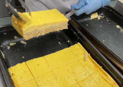 鶏ひき肉を使ったハンバーグ生地の上に、生クリームを混ぜたなめらかな卵液を流して焼く料理だったのですが、それが伝わるような料理名を考える必要がありそうです。生徒の皆さん、良い案があれば教えてください。