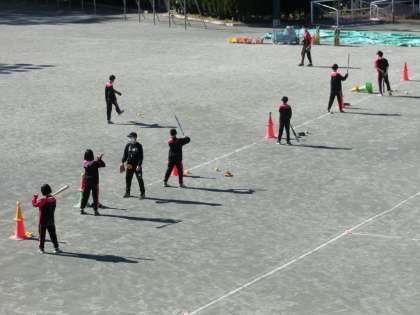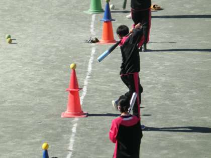 2年生の保健体育の授業ではソフトボールを行いました。今日はボールをカラーコーンにティーアップしてバッティングの練習を行いました。