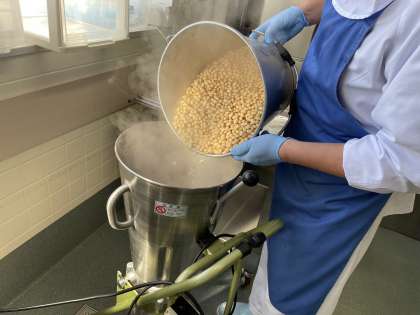 給食では、大豆を茹でてから出汁と共にミキサーにかけて味噌汁に加えています。