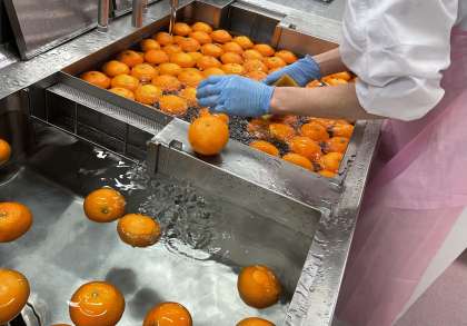 果物で提供するオレンジを洗う様子です。オレンジのヘタ部分は汚れが溜まりやすいので、ていねいに洗います。