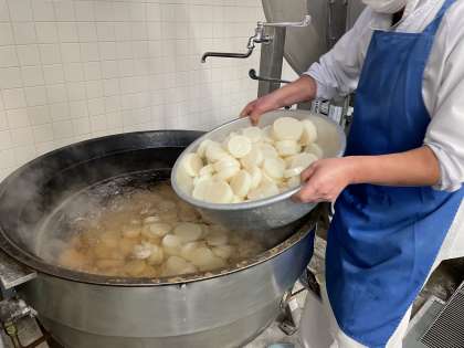 大根を輪切りにして、米のとぎ汁で下茹でしました。その後水にさらしてから、昆布出汁で煮ていく時の様子です。とてもやわらかく煮えました。