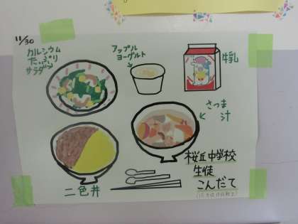 なお、本日の学び舎の日にちなんで今日は桜丘中、笹原小、桜丘小の参考が同じメニューの給食としました。