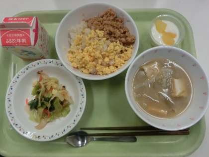 本校では家庭科の授業で生徒が作成した献立を給食で実施するといった取り組みをしています。今日は1年E組の献立で「二色丼、カルシウムたっぷりのサラダ、さつま汁、アップルヨーグルト、牛乳」でした。