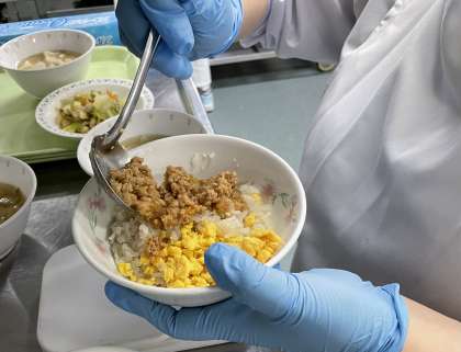 給食の展示食は、給食室で盛りつけています。今日は献立作成者にイメージイラストも作成してもらいました。イラストに近くなるように、ていねいに盛りつけています。